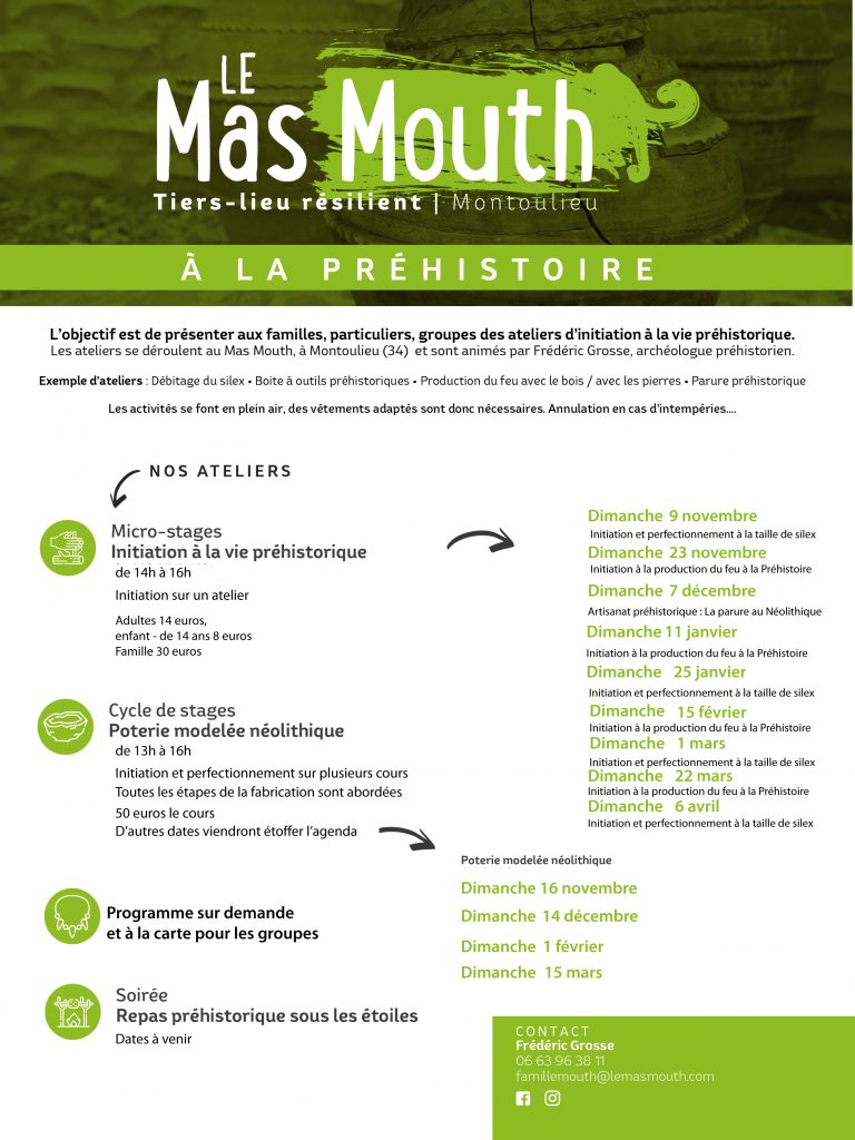 Le Mas Mouth vous propose un petit voyage dans le temps ainsi qu’une réflexion sur notre société de consommation au travers des ateliers et des stages d’archéologie du geste. Savoir faire et produire un objet à partir de ce que la nature offre… Comme autrefois, comme avant l’ère de l’industrie, de la standardisation et de la globalisation…